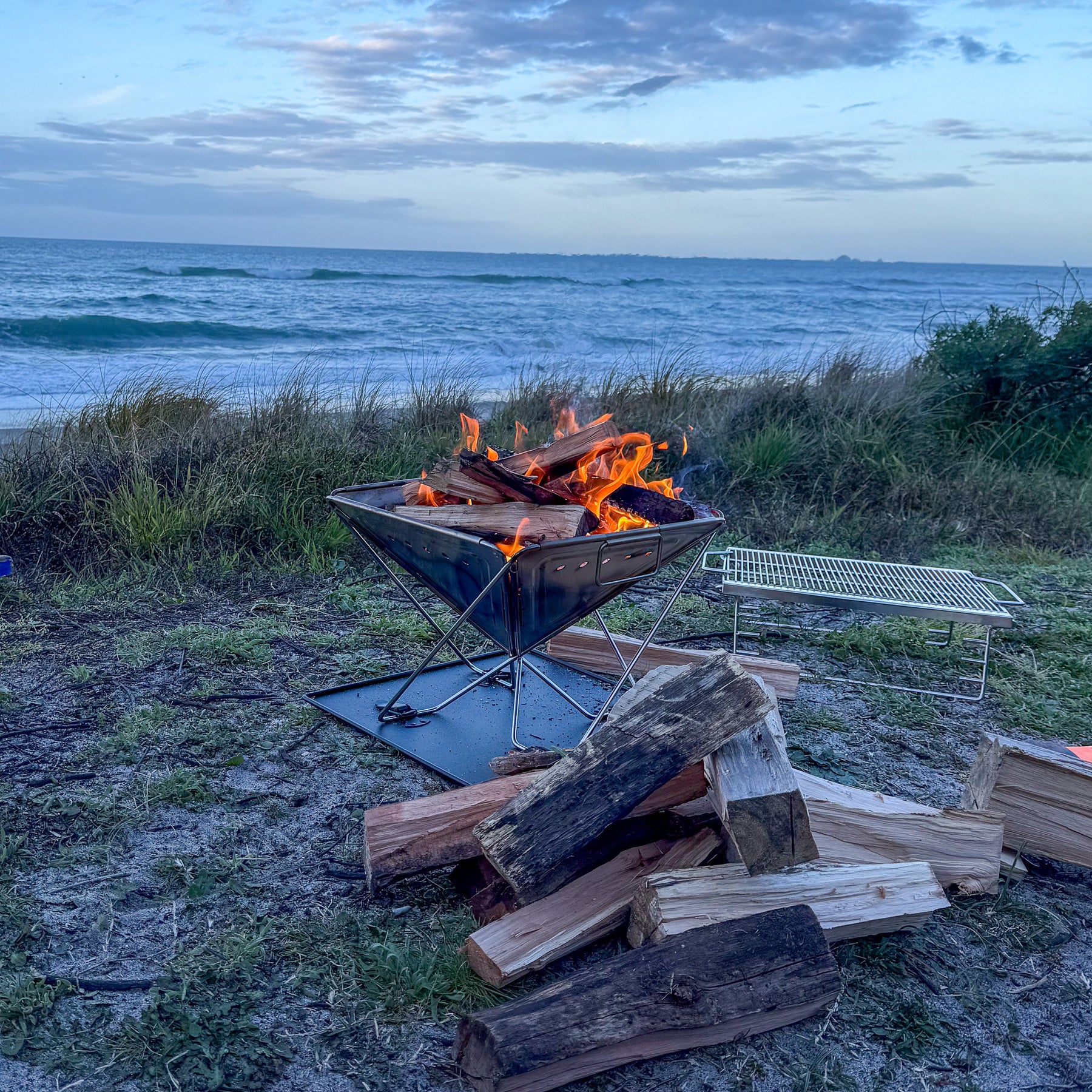 Light it up for a classic Kiwi fire to keep warm or roast some marshmallows — then chuck on the stainless steel grill when it’s time to feed the troops. The grill height adjusts, so you can sizzle steaks, sausages, or veges just how you like them. Cooks with firewood, charcoal, or heat beads.