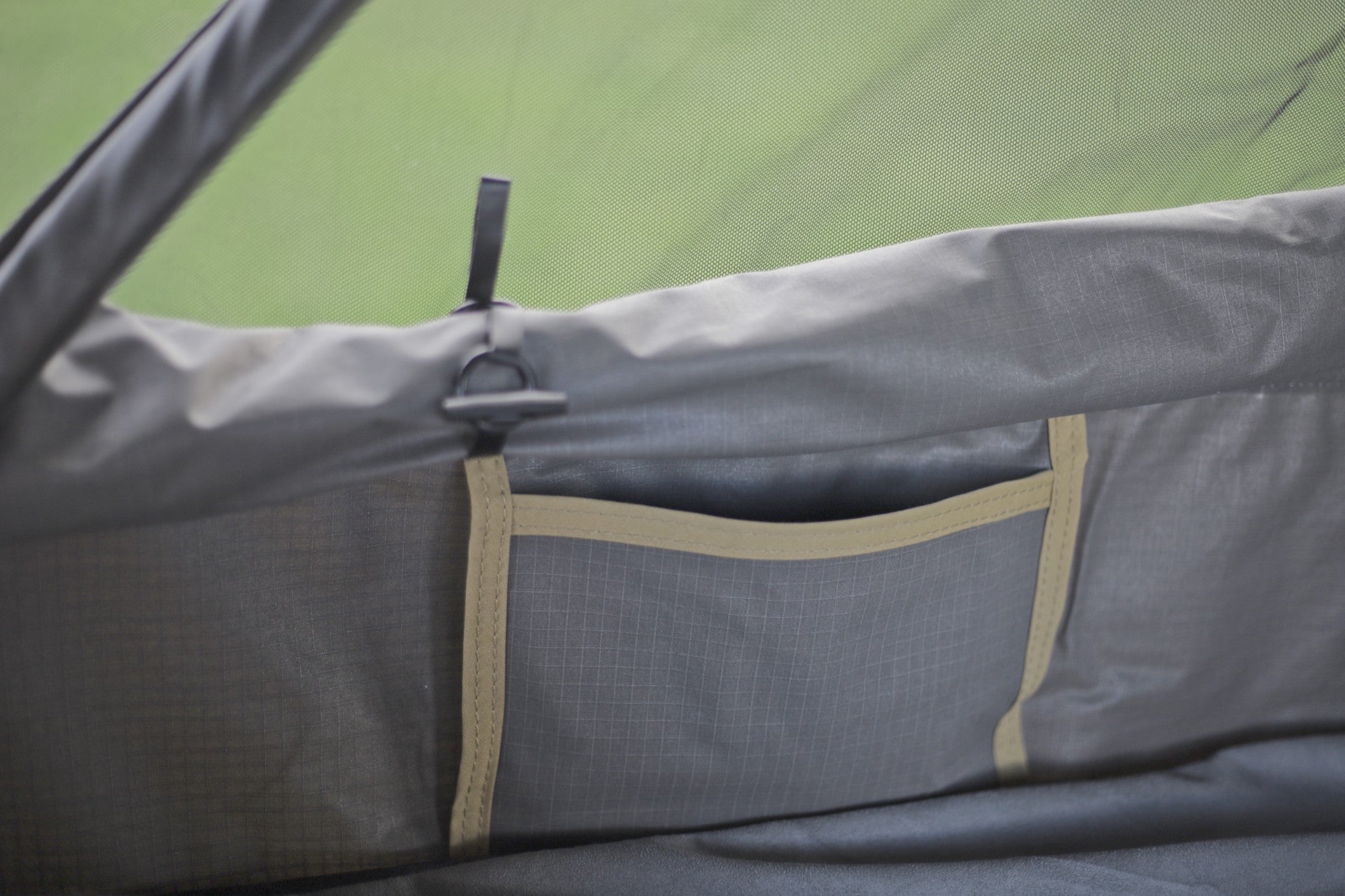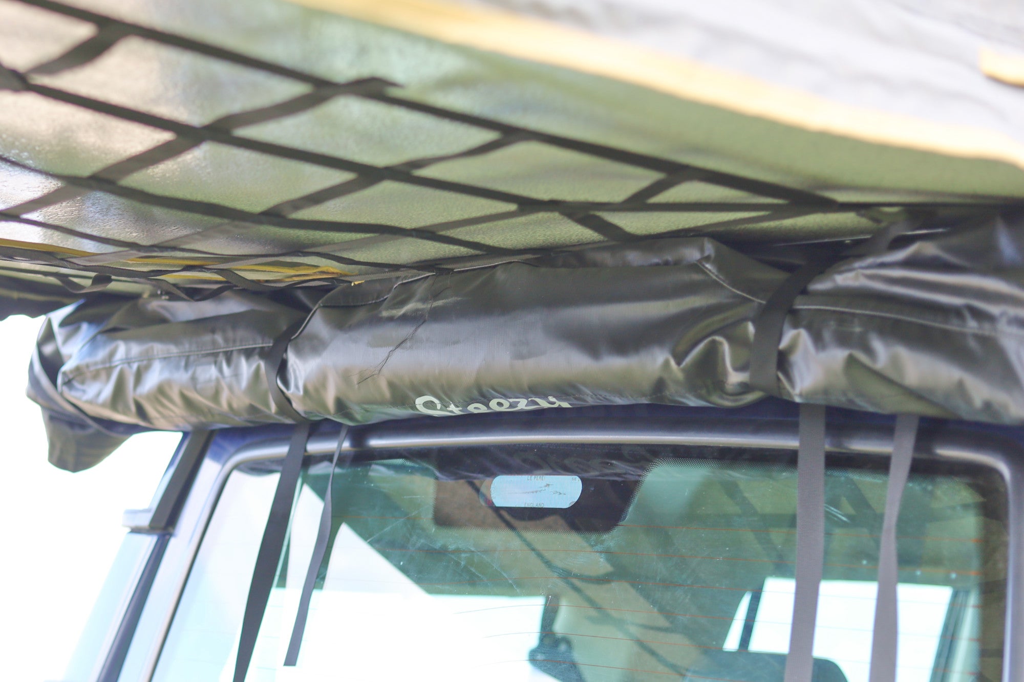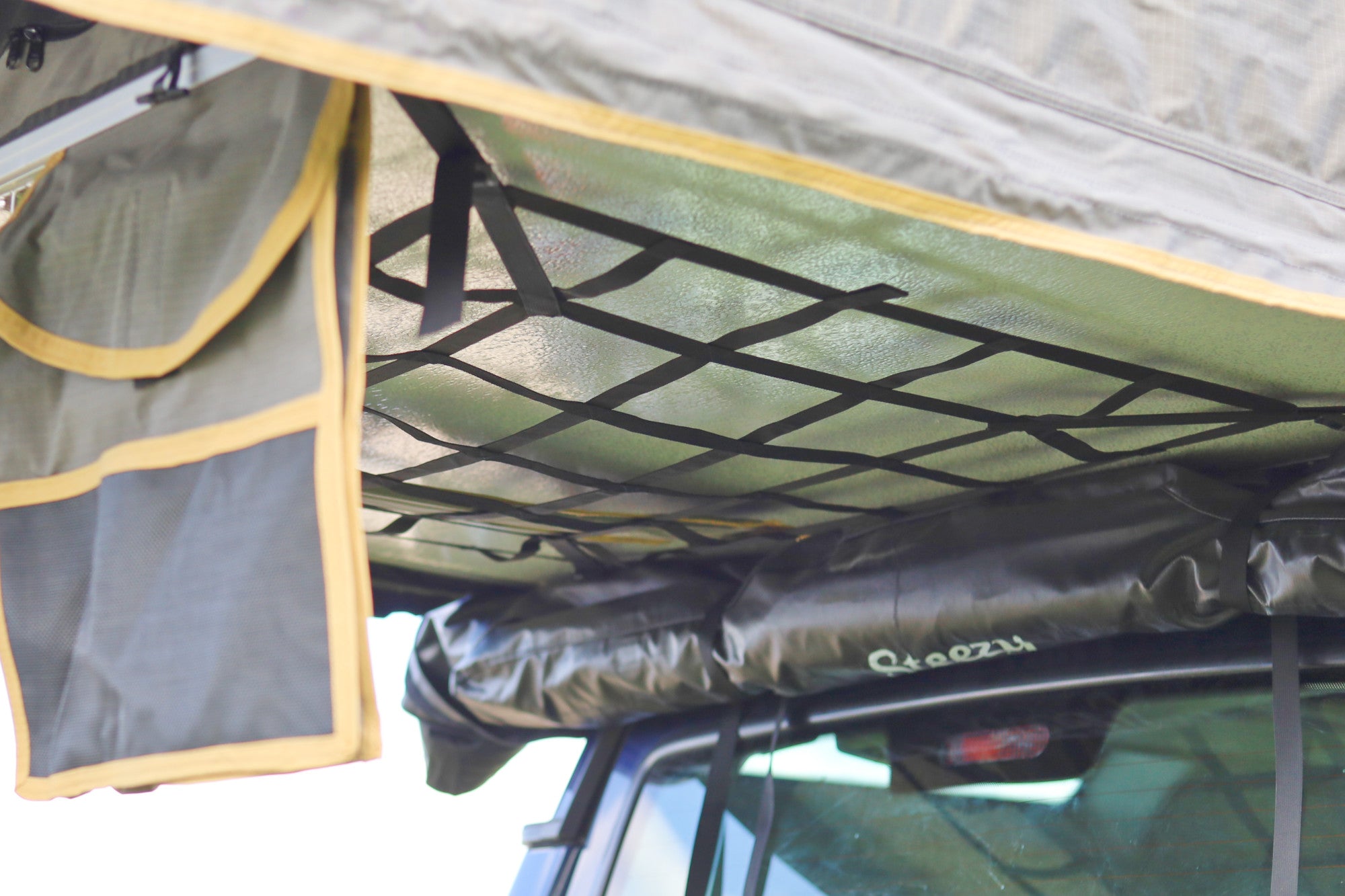 Although it lacks the extended canopy (that the Ultimate tent has), it still has a large rain fly, with walls to protect you from the weather while in the views from front and back of the tent. Large hinges, enable storage of sleeping gear (pillows, duvets, sheets ect) in the tent while traveling around.