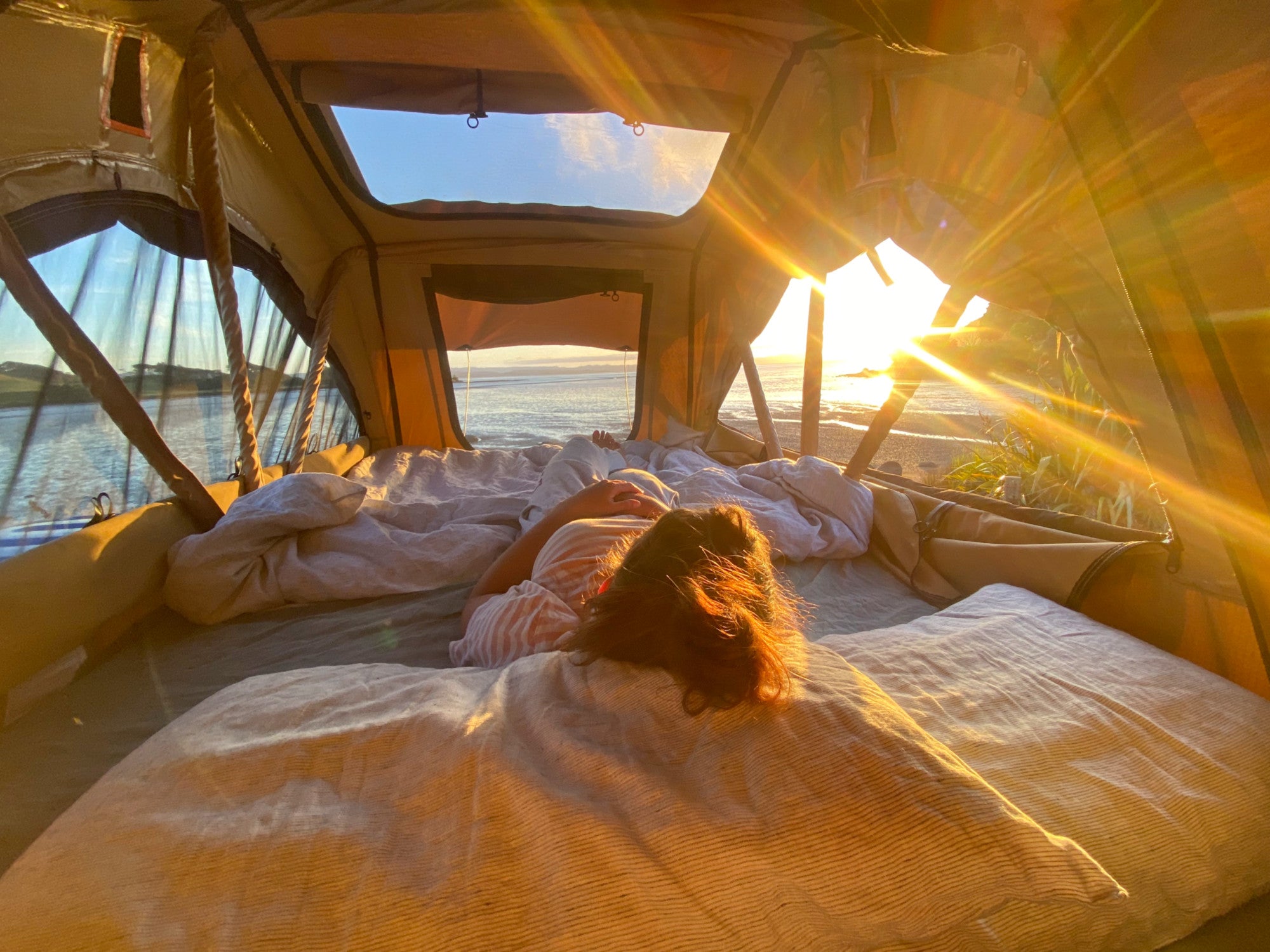 The Vibes rooftop tent, is designed for those who seek adventure, at an affordable price. We have added a PVC sky window, so you can fall asleep enjoying the stars, and any mischief Elon Musk is getting up to. All clear PVC held together with thick taped seems to provide water proof during adverse weather.